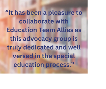 Working with Education Team Allies is specifically designed to support families who need to learn how to become an equal member of their child's educational team through positive interactions, creating appropriate paper trails, and knowing what questions to ask to get the results their child needs. Our focus is on collaborative efforts to help students achieve.